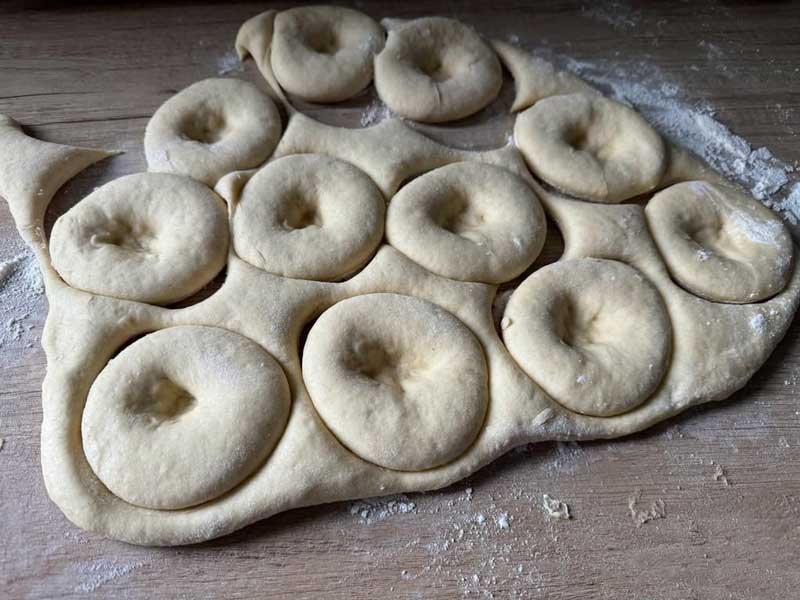 Transferați aluatul pe o suprafață presărată cu făină și întineți-l la o grosime de 1 cm. Folosiți un pahar pentru a decupa gogoșile cu un diametru de aproximativ 5 cm.