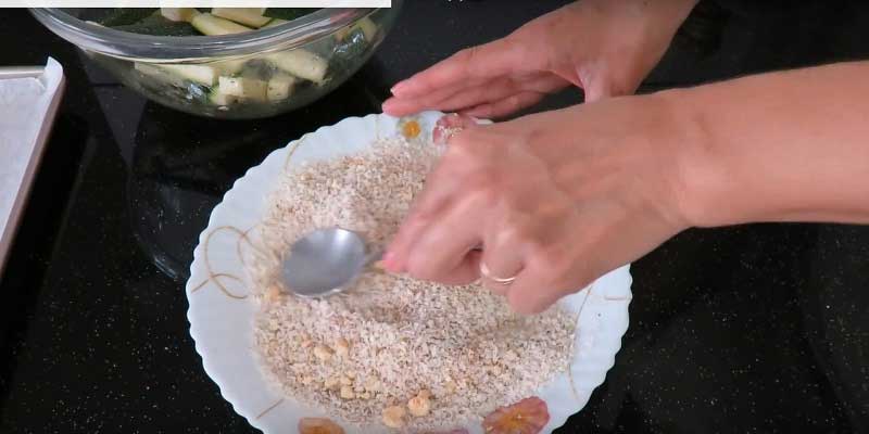 Treceti dovleceii prin oul bătut, apoi prin amestecul de pesmeți și cașcaval.