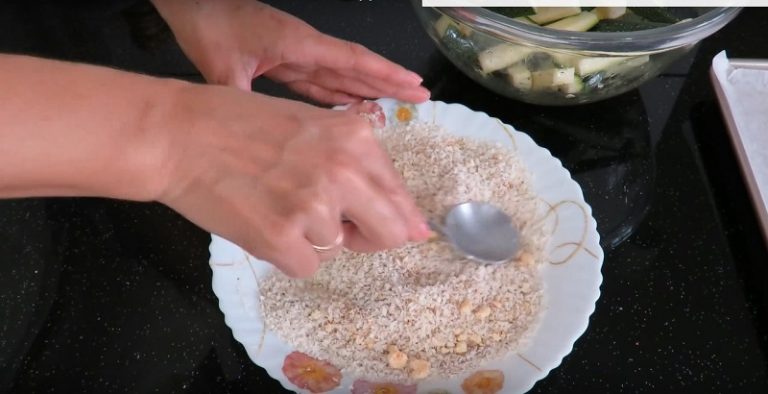 6. Dăm dovleceii prin oul bătut, pe urmă prin amestecul de pesemeți.