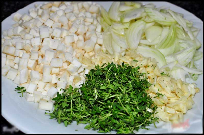 Tăiați iepurele în porții, tăiați țelina în cuburi potritive și ceapa în felii grosiere. Tocăm cimbrul proaspăt și aproximativ 8 căței de usturoi.