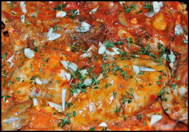 Adăugați în aceeași tavă 4 linguri de ajvar și 2 linguri de apă, amestecați bine și turnați peste carne. Adăugați cimbrul și usturoiul tocat și amestecați bine.