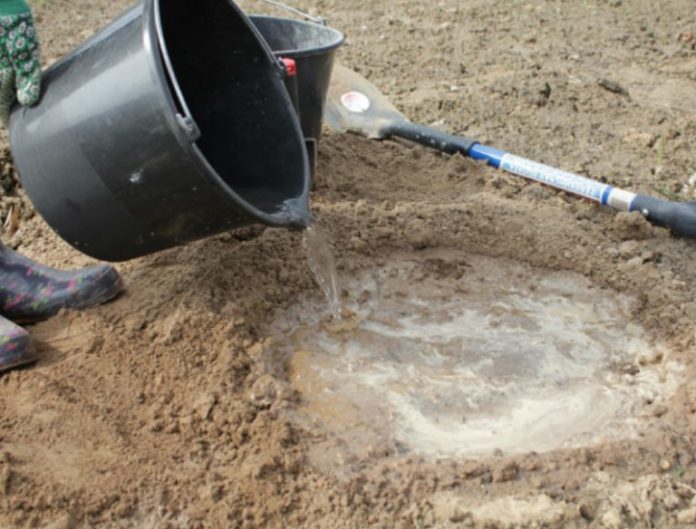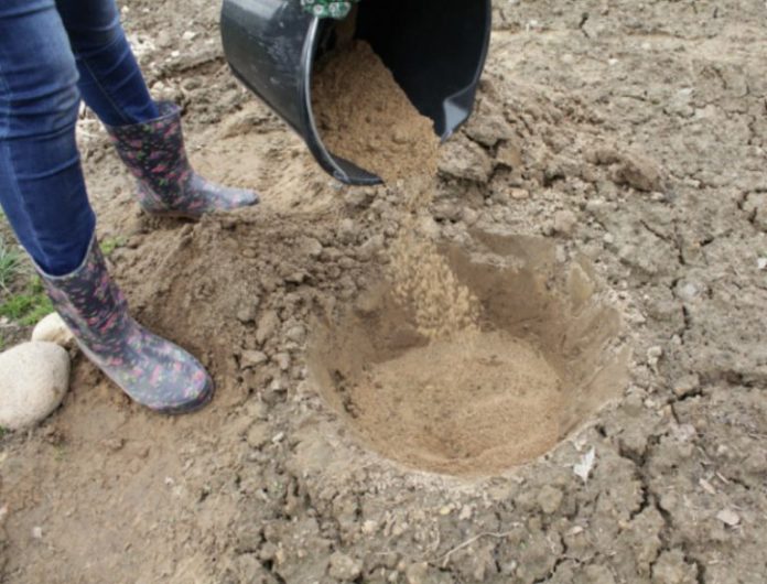 Adăugați apoi cantitatea rămasă de sol fertil sub formă de delușor, în așa fel încât să rămână 10-12 cm până la marginile gropii.