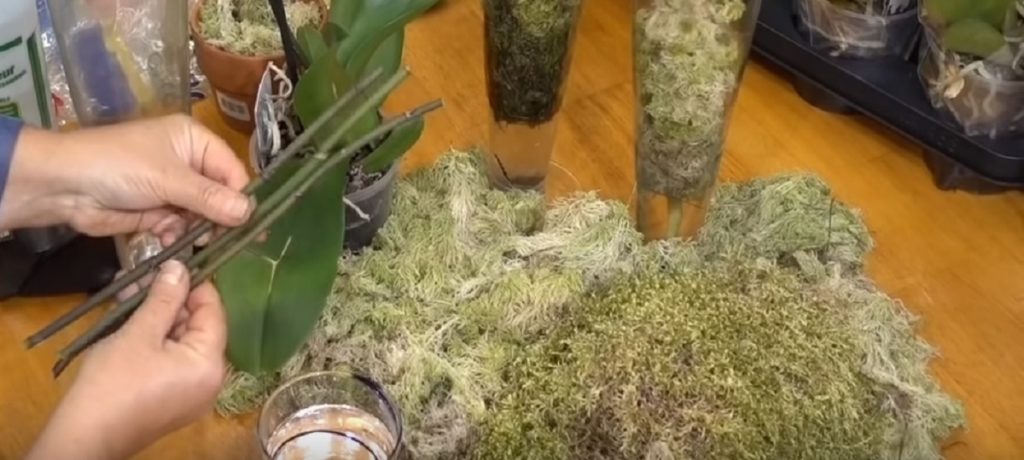 În recipientul ales, turnăm apă și punem tija învelită în mușchi în el, în așa fel încât vârful inferior să atingă nivelul apei.
