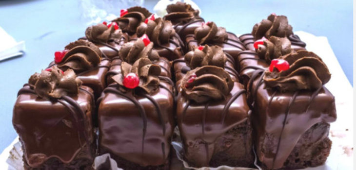 7. Taie prăjitura în pătrate de mărime potrivită, după care glazurează fiecare amandina în parte.