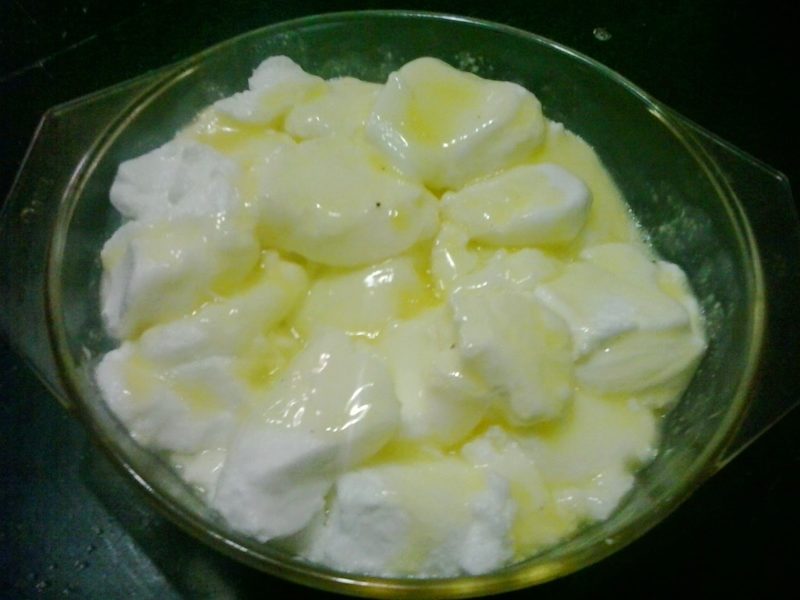Folosind o lingură, luăm din spuma de albuș și adăugăm în lapte…