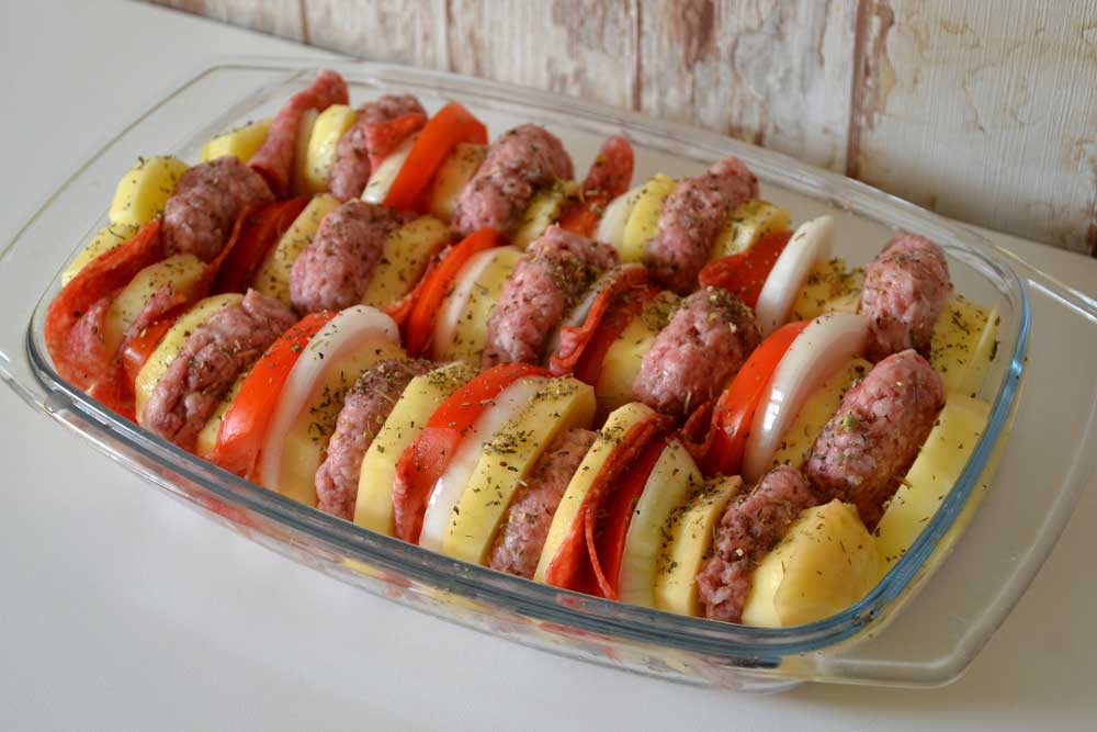 Ungem o tava termorezistenta cu ulei de floarea soarelui. Aranjam alternativ felii de cartofi, piftele de carne tocata, iarasi felii de cartofi, ceapa, rosii si salam.