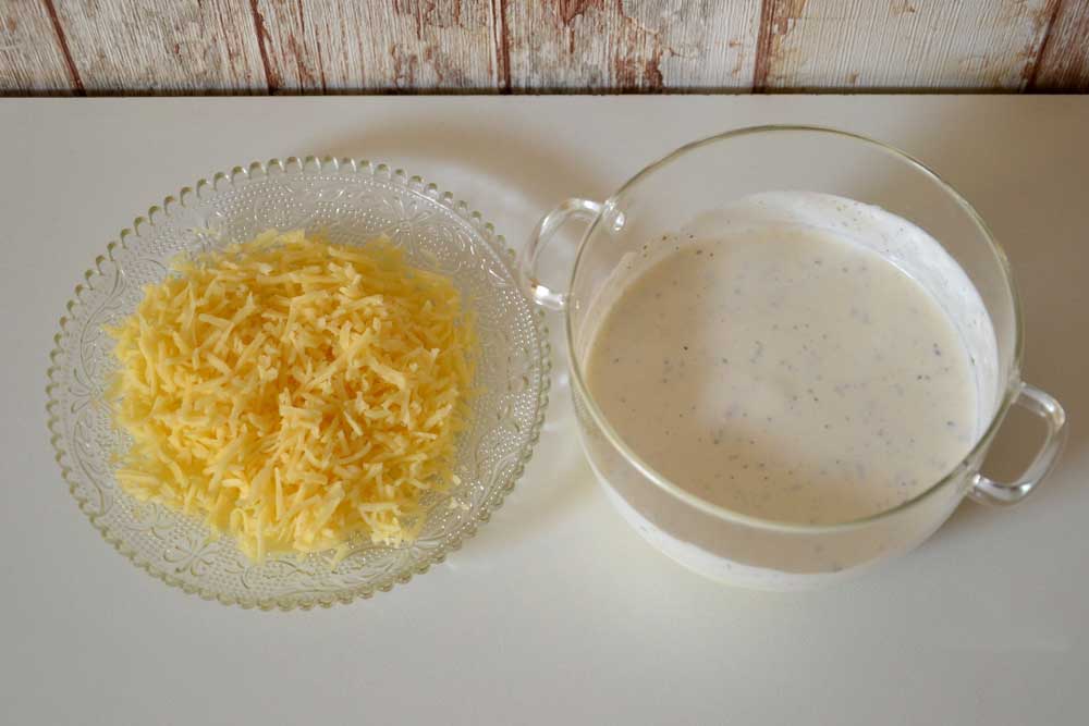 Intre timp, pregatim sosul. Amestecam iaurtul cu maioneza si usturoiul curatat si zdrobit. Condimentam sosul dupa gust cu sare, piper si ierburi aromate.