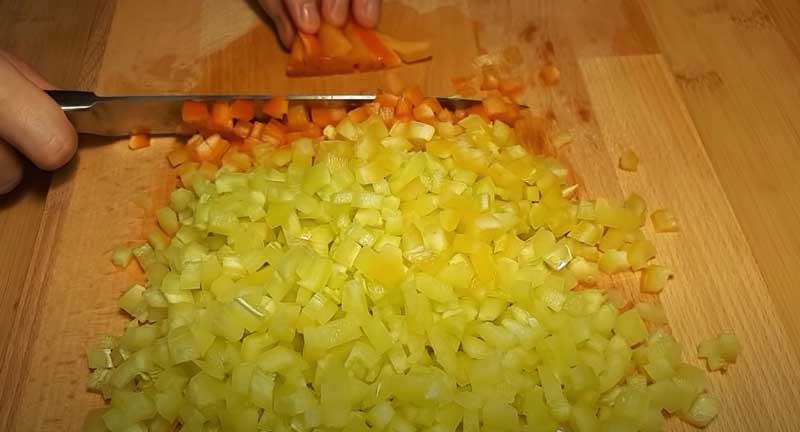 Curățați ardeii de semințe și tăiați-i în cuburi mici. Tocați mărunt pătrunjelul și mărarul.