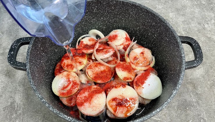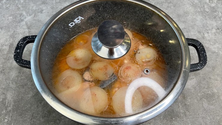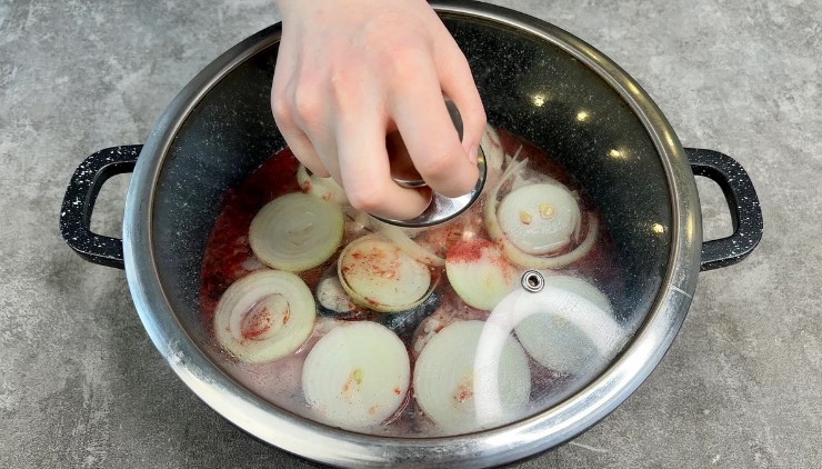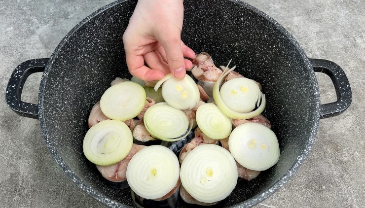 Pe fundul tigaii se aseaza rondele mari de ceapa, apoi macroul, iar deasupra, din nou, se aseaza ceapa.