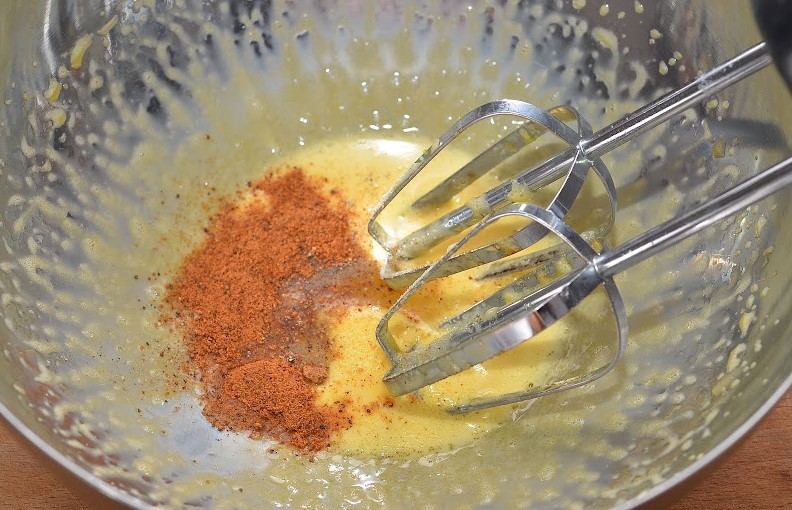 1. Bate gălbenușul cu mixerul la viteză mare până când se îngroașă și capătă o nuanță galben-lămâie.