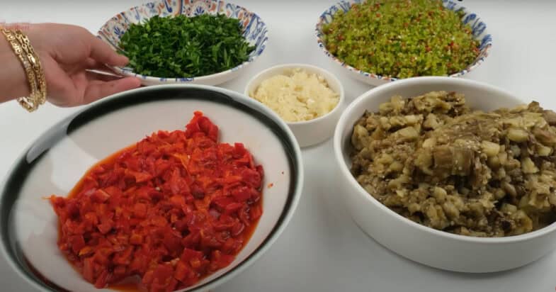 Spăl bine ardeii și vinetele, le pun într-o tavă tapetată cu hârtie de copt. Fac tăieturi mici în mijlocul fiecărei legume. Le dau la cuptorul preîncălzit la 250°C timp de 30 de minute. Apoi le transfer într-un bol, le acopăr cu folie alimentară sau o pungă și le las 10 minute să se aburească.