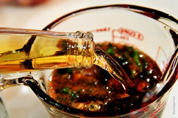 - Se amestecă vinul și uleiul. Se adaugă rozmarinul și celelalte condimente. Se amestecă bine.