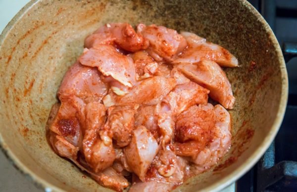 - Se taie carnea de pui în bucățele. Se adaugă condimentele, sucul de lămâie și uleiul de măsline. Se amestecă foarte bine.