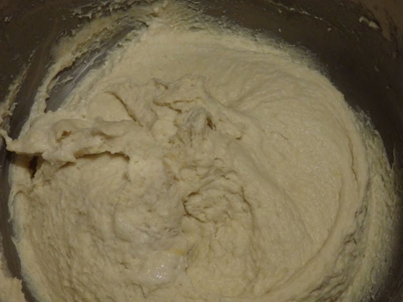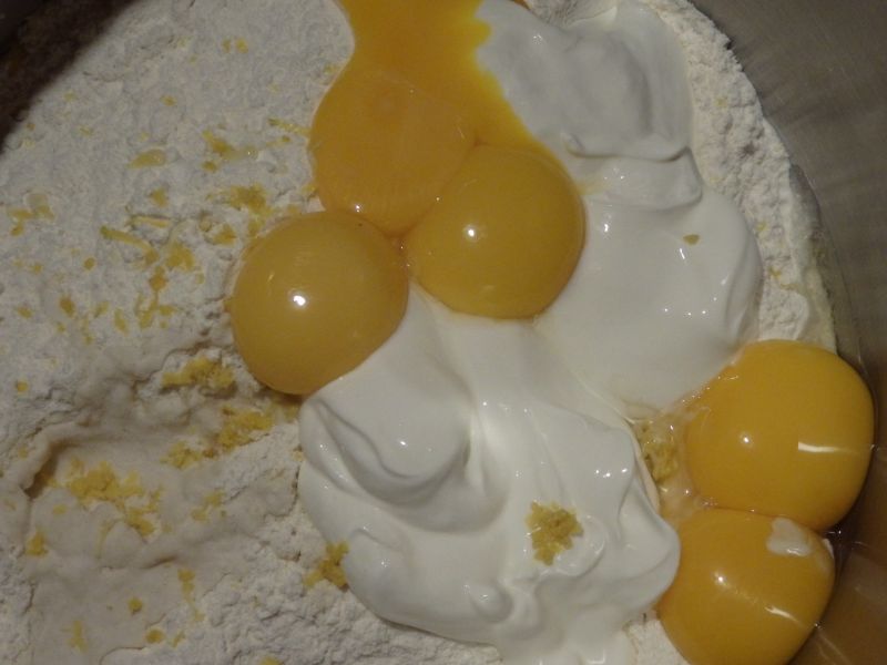 Cernem faina de grau intr-un bol incapator. Adaugam galbenusurile, smantana, otetul, coaja de lamaie, sucul de lamaie si untul topit.