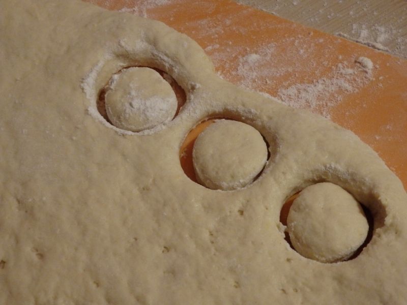 Pentru a impiedica aluatul sa se lipeasca de pahar, presarm din cand in cand marginea acestuia cu faina. Asezam cercurile de aluat pe un blat presarat cu faina si le mai lasam sa creasca aproximativ 15-20 de minute.