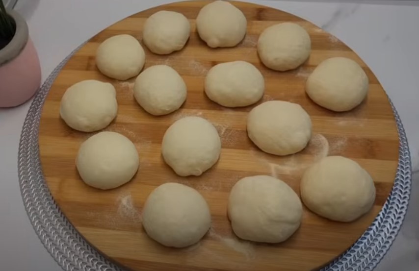 După ce aluatul a dospit, împărțiți-l în bile, fiecare cu greutatea de aproximativ 50 g.