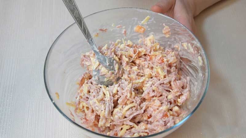 Adaugă maioneză și amestecă bine toate ingredientele pentru a forma umplutura.