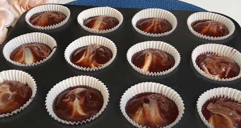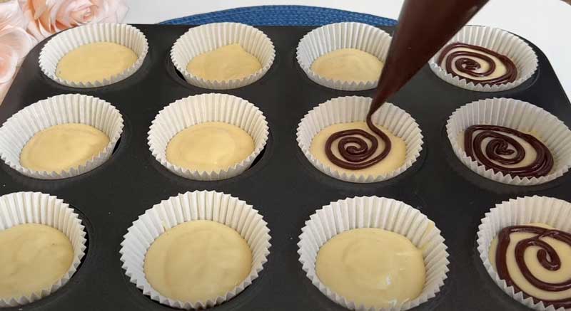 Umpleți formele pentru muffins mai întâi cu aluatul simplu până la jumătate, apoi adăugați deasupra aluatul cu cacao.