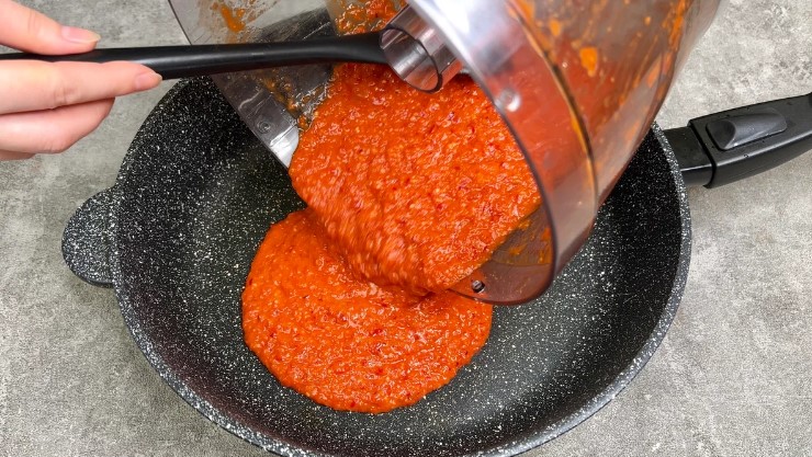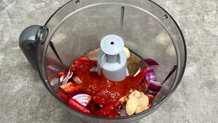 Puneți ardeiul gras, ceapa roșie, ardeiul iute, usturoiul, coaja de lămâie, ghimbirul uscat și ketchup-ul de roșii în vasul blenderului. Se toarnă ulei, puțină apă și se pisează totul până la omogenizare completă.
