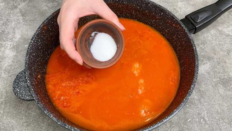 De îndată ce sosul se îngroașă, turnați apă fierbinte, adăugați zahăr, sare, amestecați și aduceți la fiert.