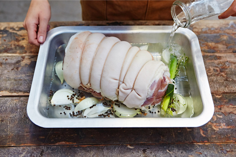 - Carnea se leagă cu un șnur, se transferă într-o tavă adâncă și se acoperă cu apă în proporție de 60%.