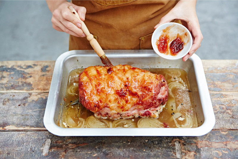 - După expirarea acestui timp, carnea se unge cu gem de portocale, se presară cu rozmarin și se trimite la cuptor pentru încă o oră.