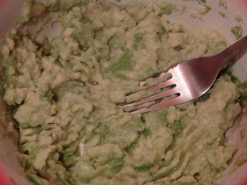 Taiem avocado in doua si-i scoatem samburele. Folosind o lingura, scoatem pulpa de avocado si o punem intr-un bol. Pasam avocado cu o furculita si il stropim usor cu zeama de lamaie, astfel incat sa nu se innegreasca.