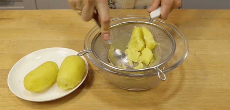 În primul rând, trebuie să pregătiți piure de cartofi. Am nevoie de 250 g de piure gata preparat, din 350 g de cartofi cruzi. Cartofii trebuie fierti, curatati si dati printr-o sita dupa care piureul se lasa la racit.
