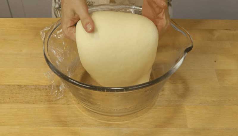 După 30 de minute de la începutul dospirii, aluatul trebuie impaturit. Am pus aluatul finit pe o masa presarata cu faina. Strâng aluatul în centru, îl acopar cu un bol și îl las să se odihnească 10 minute.
