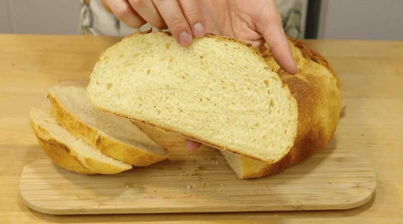 Când painea creste, fac tăieturi cu o lamă, astfel încât pâinea să se deschidă cât mai mult în timpul coacerii. Taieturile se fac usor, deoarece aluatul s-a uscat putin deasupra (pentru ca a fost acoperit cu un prosop, nu cu folie).
