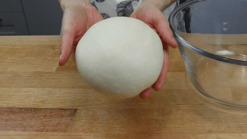 Framantam aluatul. Când incepe sa se omogenizeze, îl pun pe masă și îl frământ într-o „bila” fina. Întregul proces de frământare durează 7-10 minute. De asemenea, puteți frământa aluatul cu un mixer planetar.