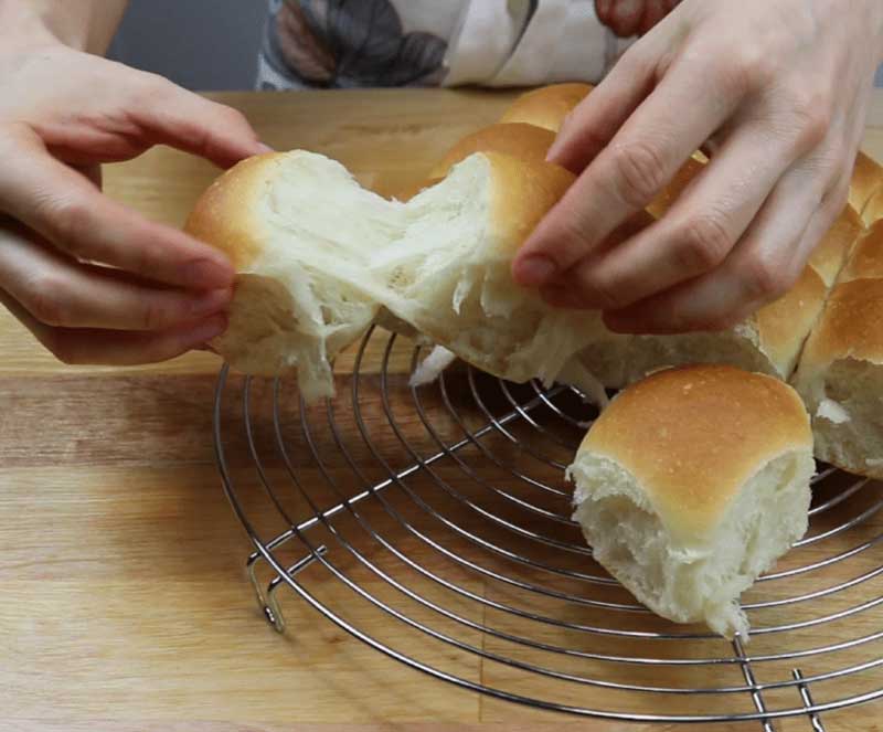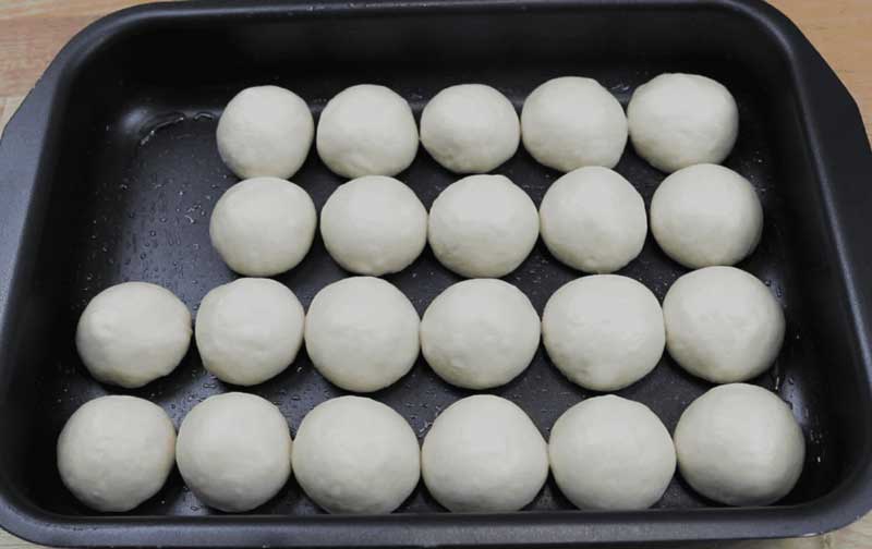 Ungeți cu ulei o tavă de copt de 30*22 cm sau o puteti tapeta cu hartie de copt. Împărțim aluatul finit în 24 de bucăți de 30-33 g fiecare. Rotunjim fiecare bila si o punem in forma sa stea 1 ora. Trebuie să coaceți chiflele la 190 ° C timp de 30 de minute dupa care se lasa la racit, pe un gratar si se pregateste dressingul.