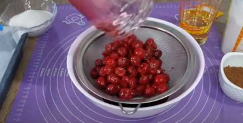 Bateți albușurile până devin spumoase și încorporați-le cu grijă în amestecul de brânză. Luați o treime din acesta, adăugați ciocolata topită, lichiorul și pudra de cacao. Amestecați până când compozitia devine uniformă. Deschideți un compot de visine și scurgeți-le într-o strecurătoare pentru a elimina lichidul. Dacă visinele sunt congelate, nu este nevoie să le decongelați.