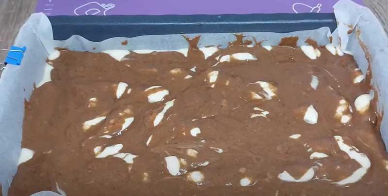 Întindeți o foaie de copt pe o tavă. Așezați un strat de aluat alb, apoi cu o lingură adăugați cel de ciocolată pentru a crea modele. Amestecați ambele straturi cu o scobitoare.
