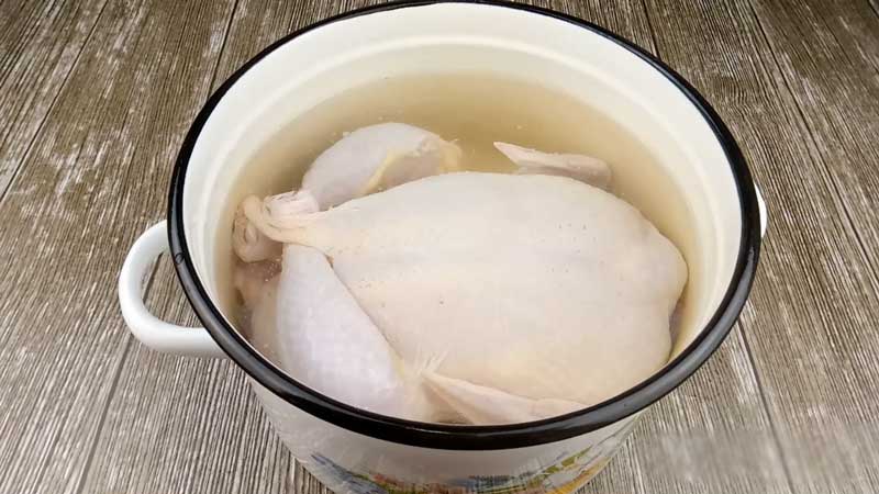 Pentru început, punem într-o oală un pui de 2 kg și îl acoperim cu apă rece. Îl fierbem la foc mic.