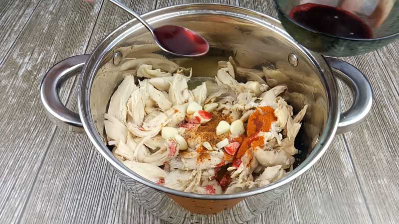 Transferăm carnea de pui într-un vas mare în care vom mărunți ingredientele. Adăugăm supa de pui cu gelatină. De asemenea, adăugăm sare, boia dulce și un amestec de piper după gust. Tăiem în bucăți 2 căței mari de usturoi. La final, adăugăm sucul de sfeclă.