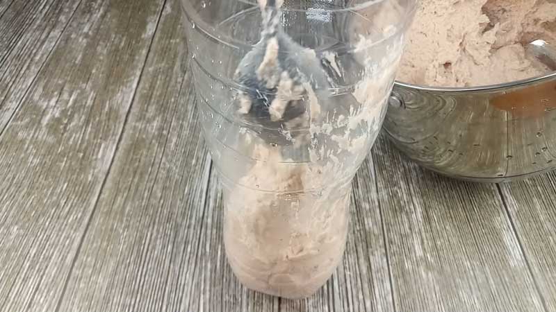 Spălăm și tăiem gâtul unei sticle de 1,5 litri. Umplem sticla cu masa obținută. O nivelăm și o compactăm, astfel încât să nu rămână goluri.