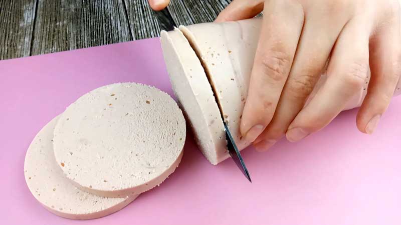 Parizerul își păstrează forma foarte bine. Este dens și se taie ușor în bucăți. Cantitatea de produs – 1 kg de parizer.