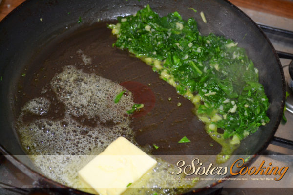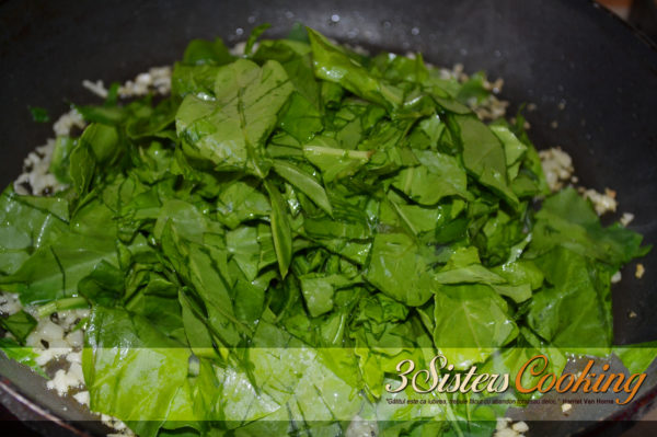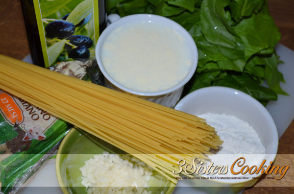 1. Puneți apa pentru paste să fiarbă, adăugând puțină sare… Tocați mărunt usturoiul și căliți-l într-o tigaie cu ulei de măsline încins (atenție, se arde foarte ușor). Adăugați apoi spanacul tocat și condimentați cu puțină sare.