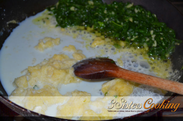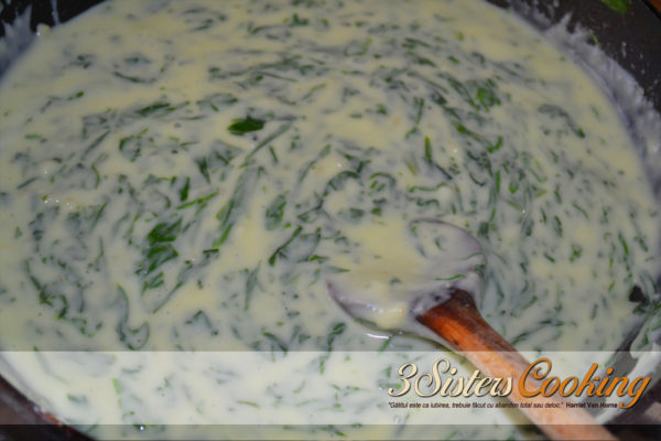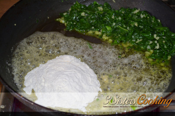 2. În continuare, pregătiți sosul cremos. Puteți să-l faceți direct în tigaie sau într-un alt vas și să-l adăugați apoi la paste și spanac. Se topește untul, se adaugă făina și se amestecă până obțineți un aluat omogen.