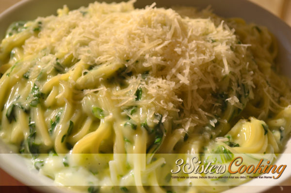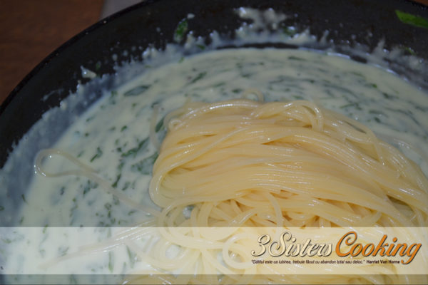 3. Se incorporează laptele călduț, în fir subțire. La final, se amestecă cu spanacul din tigaie și spaghetele fierte, condimentând cu sare și piper. Se iau de pe foc și se servesc cu mult parmezan deasupra.