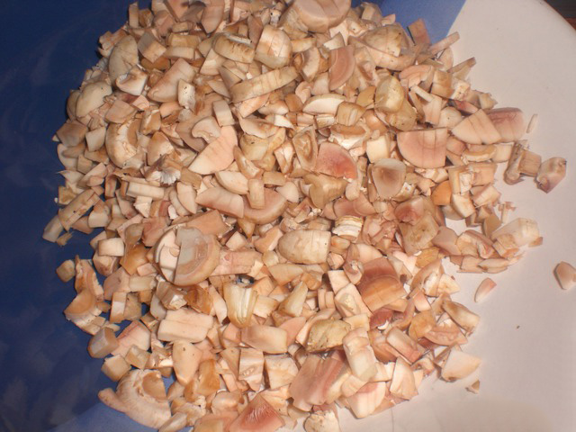 3. Cu ajutorul unui cuțit, tăiem ciupercile cubulețe. Procedăm la fel și cu ceapa. Usturoiul îl zdrobim iar morcovul îl dăm prin răzătoare.