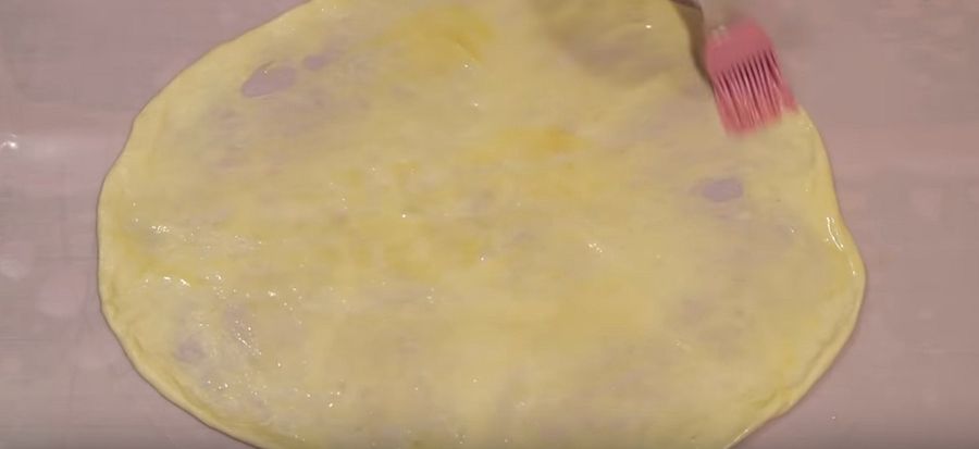 Ungem cu margarină sau unt, adunăm foaia din ambele părți, după care rulăm în formă de melc.