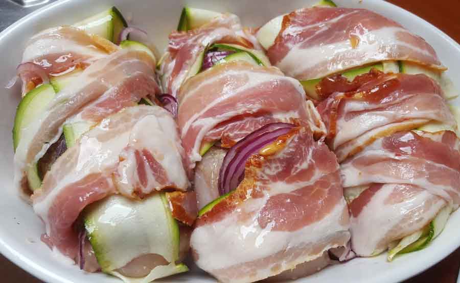 Se taie dovlecelul in felii subtiri (poti folosi un curatator de legume). Aceste felii de dovlecel le vom folosi pentru a infasura pieptul de pui. Dupa ce am infasurat pieptul in felii de dovlecel, il infasuram in felii de bacon.