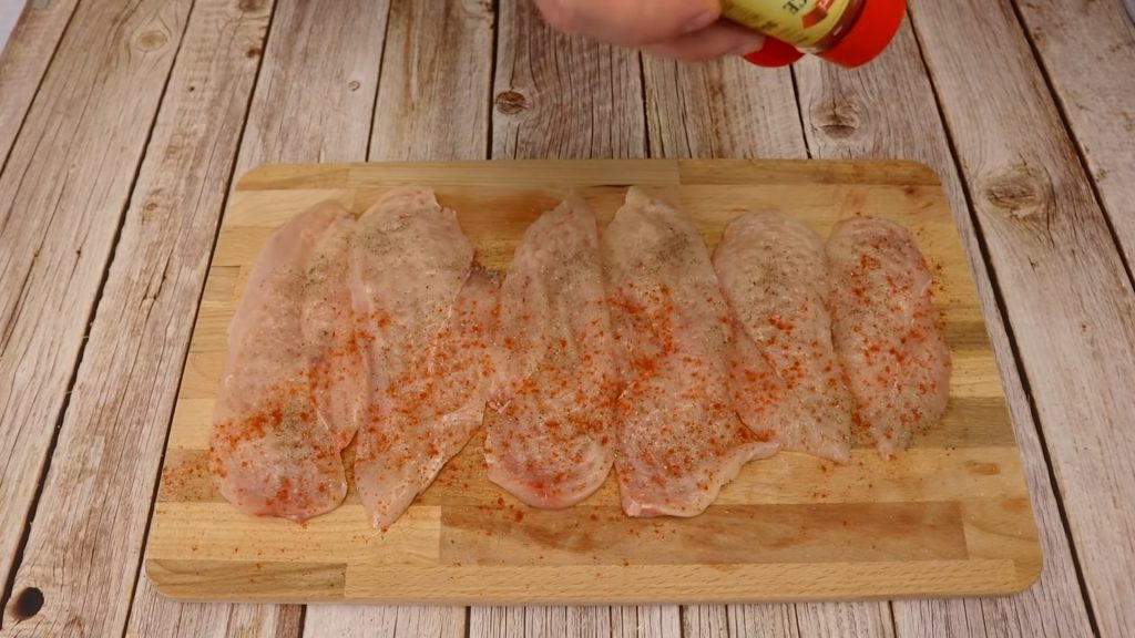 Tăiem carnea în felii pe care le frăgezim și le condimentăm cu sare, piper și boia pe ambele părți.