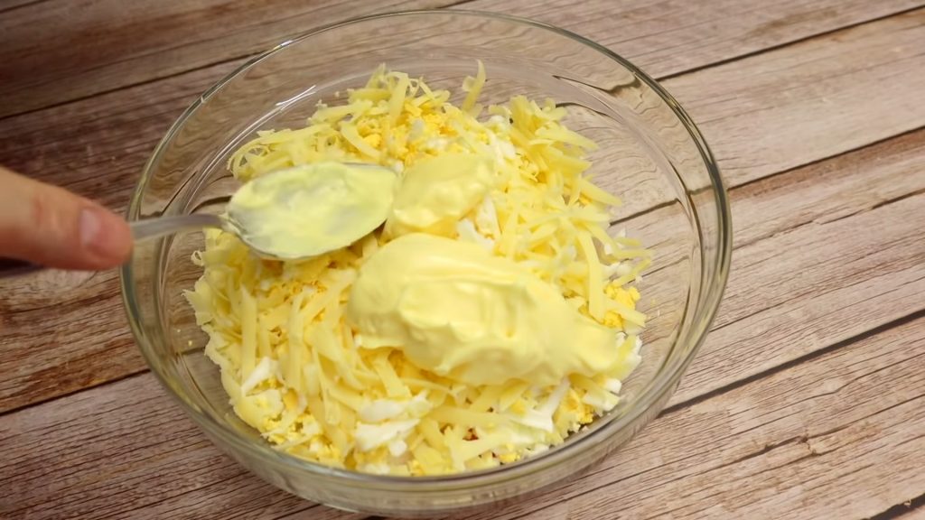 Tocăm mărunt ceapa și roșia după care le transferăm într-un bol. Adăugăm și ouăle date pe răzătoarea mare, cașcaval ras, maioneza și amestecăm foarte bine.