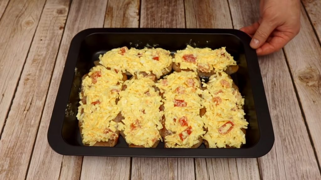 Acoperim fiecare felia cu amestecul de ouă și cașcaval după care punem și cașcavalul ras rămas.