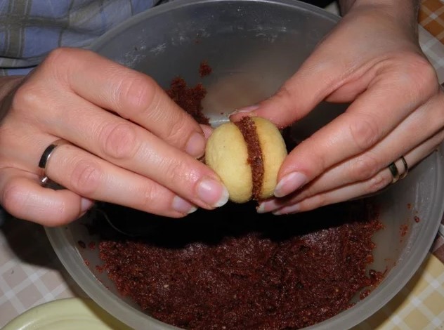 Din aluatul respectiv se fac bilute mici de aluat – cu cat sunt mai mici cu atat se vor coace mai repede si vor fi mai moi dar puteti face bilutele dupa cum va place mai mult.
