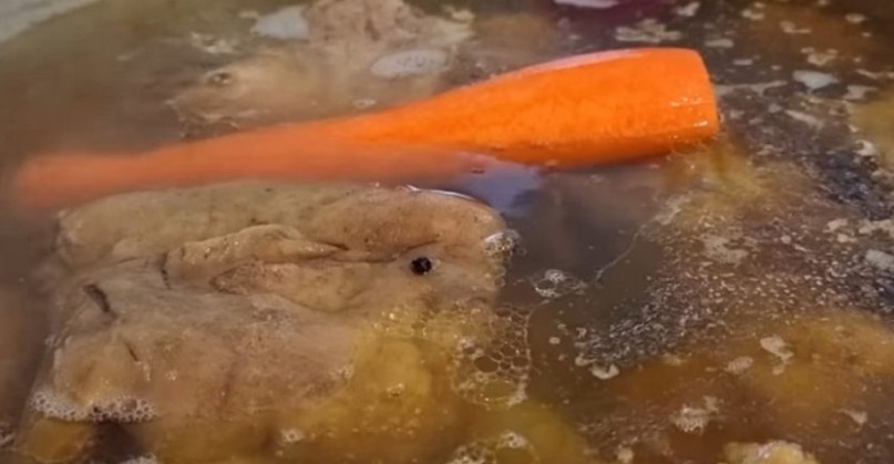 Scurgeți prima apa și turnați din nou apă rece peste carne. Adăugați în oală ceapa, sarea, piperul și frunza de dafin. Gătiți carnea timp de 3 ore pe foc mic. Adăugați în oală morcovul curățat și usturoiul. Gătiți supa pentru încă 2-3 ore.