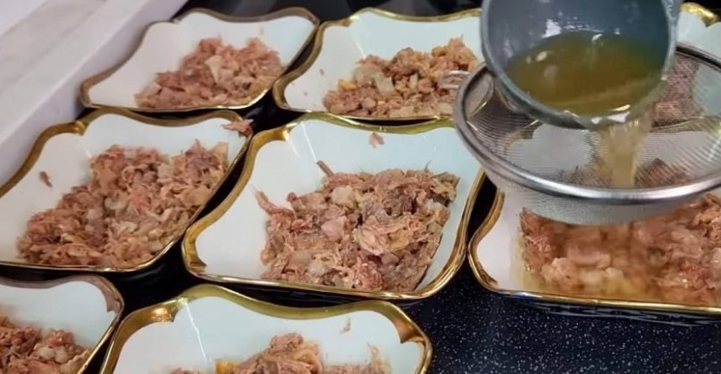 Ungeți farfuriile pentru servirea aspicului cu ulei, așezați carnea și turnați peste ea supa, strecurând-o printr-o sită.